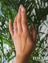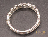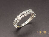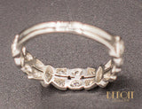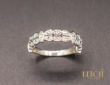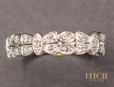 Alliance en platine agrémentée de motifs de noeuds dans le style Art Déco de l'époque, sertis de diamants. Les motifs couvrent les deux tiers du biou, le bas de l'anneau est lui plus fin et creusé d'une raynure décorative.
