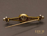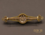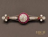 Broche en or jaune 750 millièmes composée au centre, d'un léger dôme orné d'un pavage de diamants taille ancienne, entouré de rubis calibrés. De chaque coté, une goutte est pavée de diamants taille ancienne et terminée par un bouquet de diamants en sertis clos ceinturés de rubis calibrés. Les diamants sont sertis sur réhaut de platine et soulignés de millegrain. Système broche à l'arrière en or jaune 750 millièmes. Très beau travail, délicat et représentatif du savoir-faire de la période Art Déco. Excellent état.