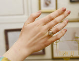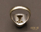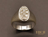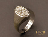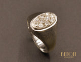 Chevalière en or blanc 750 millièmes dont la tête ovale est pavée de diamants demi taille. Joli travail de mise à jour en nid d'abeille à l'arrière. Aspect de surface texturé, brossé épais. Typique des années 1950.