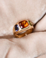 Bague en or jaune signée "Chanel" de la collection Baroque, ornée de trois belles pierres, au centre une citrine orange et, de part et d'autre, une améthyste et un péridot, taille coussin, serties dans la masse du corps de bague joliment bombé sur le haut et repartant en fuite. Un modèle rare numéroté en très bon état.