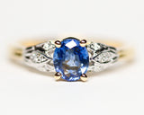 Bague Création Benoît Joaillier en or jaune 750 millièmes, surmonté d'or blanc 750 millièmes, dont le centre est serti d'un Saphir taille ovale de couleur bleu serti sur 4 griffes. De part et d'autre de la bague, des "feuilles" d'or blanc sont serties de petits diamants et ouvragées de millegrain. Corps de bague avec rainure.