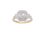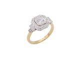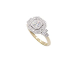 Bague Création Benoît Joaillier en or jaune 750/1000e surmonté d'or blanc 750/1000e dont le centre est serti d'un diamant taille brillant 0,42 carat G-Si serti double grains dans un carré pans coupés. Entourage diamants d'inspiration Art Déco. Corps de bague simple en demi rond.