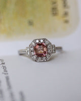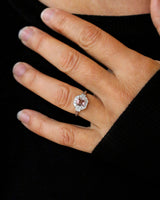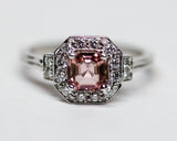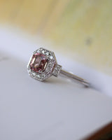 Bague Création Benoît Joaillier en or blanc 750 millièmes, de style Art Déco, dont le centre est orné d'une tourmaline rose pâle sertie sur griffes, encadré d'un carré pans coupés, pavé de diamants taille brillant et de grains. Palmettes agrémentées d'escaliers de diamants taille brillant. Panier ajouré et corps de bague monté en trompe l'oeil en deux fils. Filet millegrain.