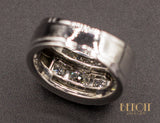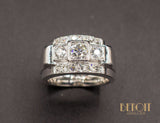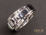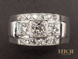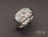 Bague Tank en platine ornée d'un diamant taille ancienne d'environ 0,35 carat puis de deux diamants taille ancienne d'environ 0,10 carat chaque, les trois sertis sur des carrés de platine, eux-mêmes accompagnés de deux rangs de diamants taille ancienne terminés par deux godrons. Une bande d'or blanc 750/1000e décorative, de couleur légèrement plus jaune que le platine, fait le tour de l'anneau. Bijou de pur style Art Déco Moderniste.