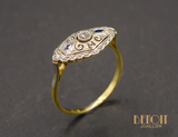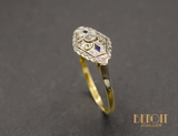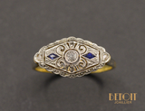 Bague Art Déco filigrane en Or jaune 750 millièmes rehaussé de platine de forme losange, dont le motif est ciselé de volutes. Au centre, un Diamant taille ancienne en clos perlé, épaulé de 2 Saphirs Verneuil calibrés et d’un diamant taille rose à chaque extrémité. Plateau joliment travaillé de volutes et de grains surmonté de millegrain. Corps de bague sobre et très fin. Panier canelé.