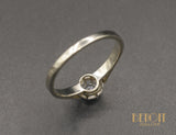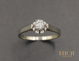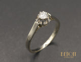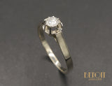 Solitaire en or gris 750/e orné en son centre d'un diamant coussin taille brillant, estimé environ H-SI, d'environ 0,23 carat, serti dans un chaton de platine huit griffes, posé sur un corps de bague section carrée, dont les palmettes s'élèvent jusqu'au milieu du chaton.