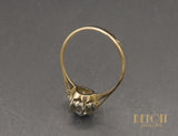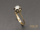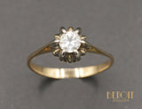 Solitaire en or rose 750/e orné en son centre d'un diamant taille ancienne d'environ 0,40 carat, serti dans un chaton rehaussé d'or blanc 750/e six griffes, agrémenté de godron entre chaque griffe. Un corps simple et fin, pincé, arrivé à la tête de bague.