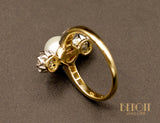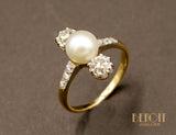 Bague en or jaune 750 millièmes ornée d'une perle fine en son centre et accompagnée de deux diamants taille ancienne de ~0,30 ct chacun sur chaton de platine. Le corps de bague est sobre et est serti de chaque côté de trois diamant taille rose sur réhaut de platine. Bijou élégant, de belle facture.