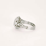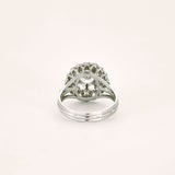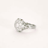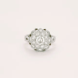 Bague Marguerite faite en fil de platine, datant de 1950. Le plateau représente une fleur à double rang de pétale dont le centre est serti d'un Diamant, certifié HRD de 0.53 ct, dans la masse, entouré par un pavage de diamants brillants avec un joli travail de grain. Le panier est ajouré comme une continuité de pétale, ainsi que sur les palmettes, avec une feuille de chaque coté. Corps de bague en 3 fils avec présence de deux billes, retrait sur demande.