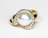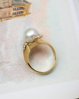 Bague de type jonc en or jaune 750 millièmes ornée en son centre d'une perle de culture bouton posée au centre d'une forme ronde ouverte en partie pavée de diamants taille brillant. Le corps de bague est évasé sur le haut et souligne dans une jolie torsion la tête de bague. Le reste du corps est plat et large. Bijou en très bon état.