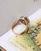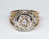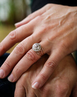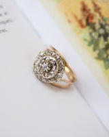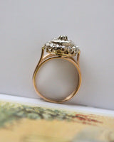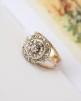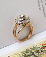 Bague marguerite en or rose 750 millièmes, dont la tête datant du 19ème siècle est ornée au centre d'un diamant taille brillant serti 8 griffes en argent, accompagné d'un double entourage de diamants taille rose (dont un ébréché) sertis sur réhaut d'argent et grains. L'ensemble est posé sur un corps de bague minimaliste constoitué de trois fiols en or rose 750 millièmes de manufacture vintage. Bijou en bon état.
