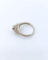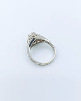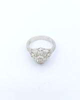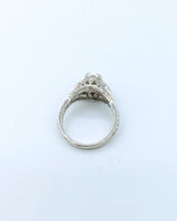 Bague Solitaire style Art Déco en or Blanc 750/e, orné d'un Diamant Rond Taille Moderne se positionnant au centre de différentes formes géométriques ajourées, certaines serties d'un Diamant Baguette et d'autre pavées de Diamants taille brillant sertis en grain. L'ensemble forme un joli dôme entièrement souligné d'un filet perlé. Corps de bague plat pavé de chaque côté d'une ligne de diamant taille brillant sertis grains et millegrain. Bijou en excellent état.