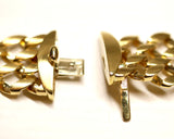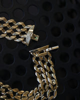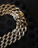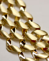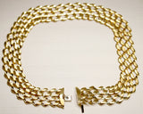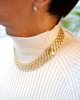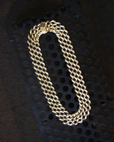 Collier large en or jaune 750/1000e, composé de trois rangs imbriqués de mailles plates et torsadées. L’alternance de finitions brossée à l'extérieur des mailles et polie sur le reste de la surface crée un subtil jeu de contrastes, apportant élégance et légèreté à l’ensemble. Fermoir à cliquet avec sécurité. Bijou en très bon état.