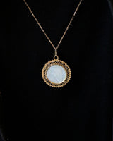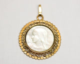 Médaille religieuse ancienne en nacre représentant la Vierge Marie dans un double entourage en or Rose, le premier en fil arabesque millegrain et le second en perle plate. L'ensemble est surmonté d'un anneau rond et d'une bélière simple. Bijou en bon état, chaîne non fournie, sur commande.