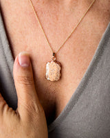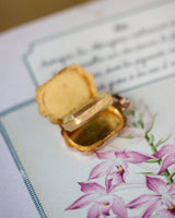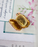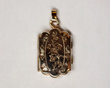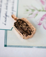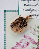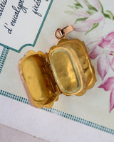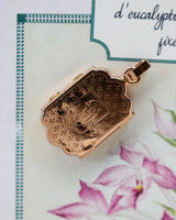 Pendentif ouvrant en or rose 750/e, de forme livre, dont la face avant est finement gravée d'un motif floral et la face arrière est ornée au centre d'un blason gravé, entouré de motifs formant des pétales. A l'intérieur, se trouve deux espaces creux séparés par un verre bombé. Bélière droite et fine. Bijou unique qui allie symbolisme et histoire. Bijou en bon état avec quelques légers coups dus à son grand âge. Chaîne non fournie, sur commande.