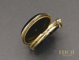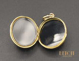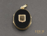 Pendentif en or jaune 750 millièmes ouvrant, orné de chaque côté de plaques d'onyx. L'une des faces est sertie au centre d'un motif blason en or jaune. Volet en verre cerclé d'or mobile à l'intérieur permettant de glisser une photo. Chaîne non fournie, sur commande.