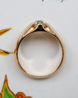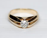 Solitaire en Or Jaune 750 millièmes, orné d'un Diamant Taille coussin Taille Ancienne (Estimé ~ K-Si3) serti en masse. Corps large avec une rainure rejoignant le diamant. Bague mixte en bon état.