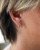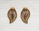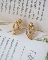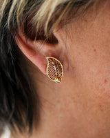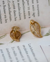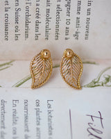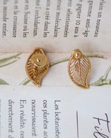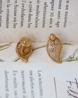 Paire de boucles d'oreilles en or jaune 750 millièmes, représentant une feuille avec ses nervures en fil dont la bordure est soulignée d'un fils torsadé. Le tout est surmonté d'une boule dont est rattaché un système smartlock.