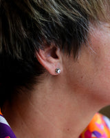 Paire de puces d'oreilles en or blanc 750/e ornées d'un diamant rond taille ancienne (estimé H-Si) serti huit griffes sur chaton gaufré. Système Alpa en or blanc 750/e pour oreilles percées. Bijou ancien en très bonne état.