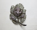 Broche en or blanc 750/1000e et platine représentant une rose et dont l'ensemble des éléments la composant est entièrement pavée de diamants taille moderne, baguette et calibrés pour la tige. Très belle composition en bon état.