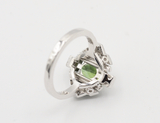 Bague Création Benoit Joaillier en or blanc 750 millièmes, ornée en son centre d'une Tourmaline verte de forme ovale de 1,42 carats. En haut et en bas, un diamant taille princesse de 0,10 carat est serti en clos. Corps de bague géométrique en fuite et pavé de diamants.