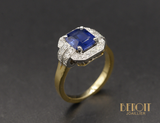 Bague signée Benoit Joaillier en or jaune et blanc 750 millièmes dont le saphir bleu, taille émeraude de 1,50 ct, est serti sur quatre griffes et entouré de diamants dans un décor rectangle pans coupés. De chaque côté, deux godrons sertis de diamants, inspiré de l'Art Déco, descendent sur le corps de bague section carrée.