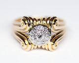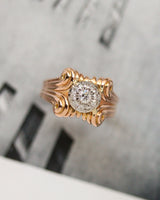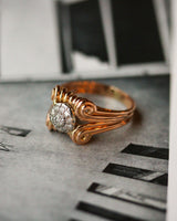 Bague datant des années 1950 se composant de fils en or rose 750 millièmes représentant un coussin bordé de godrons sur lesquels repose une forme ronde ornée au centre d'un diamant taille ancienne, teinté avec inclusions, entouré de diamants taille moderne. L'ensemble serti en grain et clos sur platine. Un bijou original en très bon état.