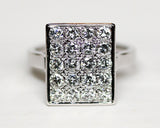 Bague Art Déco en or blanc 750 millièmes, composé d'un plateau rectangulaire entièrement pavé de Diamants taille brillant (estimés ~ G-Si). Panier ajouré croisillon. Corps de bague assez large et plat. Bijou en très bon état.