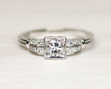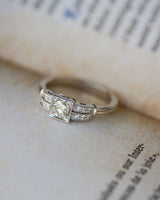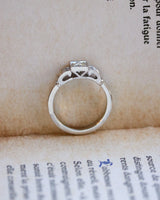 Solitaire Création Benoît Joaillier en or blanc 750 millièmes dont le centre est orné d'un diamant taille moderne de 0,39ct estimé H-VS2 serti en clos et grains dans un carré. De chaque coté, deux godrons sertis de diamants, inspiré de l'Art Déco, descendent sur le corps de bague composé de deux fils.