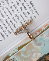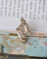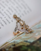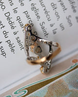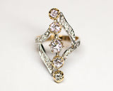 Bague Marquise en or rose et blanc 585 millièmes ornée au centre d'une ligne de cinq diamants taille ancienne (nombreuses inclusions et teintés) sertis griffes, au centre de volutes pavées de diamants taille ancienne sertis grains sur or blanc.