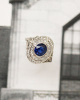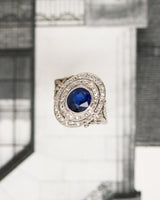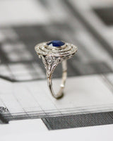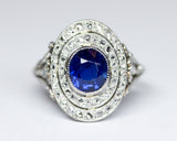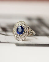 Bague Pompadour en platine, ornée au centre d'un saphir ovale bleu vif (légèrement égrisé sur le dessus) serti clos et millegrain, accompagné d'un double entourage de diamants taille rose sertis en gains et filet millegrain. Les palmettes sont composées d'un motif floral pavé de diamants taille rose. Panier joliment repercé et travail de gravure sur les tranches hautes du corps de bague. Bijou intemporel en très bon état.