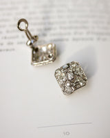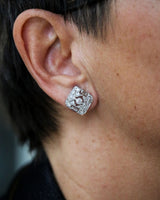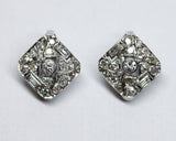 Paire de boucles d'oreilles en or blanc 750 millièmes et platine (sertis), composé de différentes formes formant un losange ajouré, entièrement pavé de diamants taille ancienne sertis grains et dont le centre est orné d'un diamant taille ancienne serti clos et millegrain, souligné de part et d'autre d'un diamant taille baguette. Fermoir à clip pour oreilles non percées. Très beau bijou en bon état.