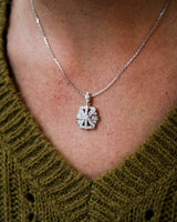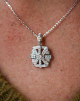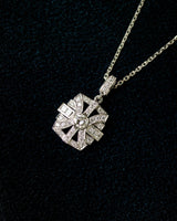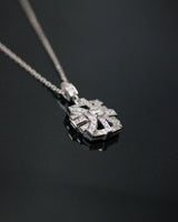 Pendentif Création Benoit en or blanc 750 millièmes, ornée en son centre d'un diamant taille ancienne de 0,32 carat serti clos au milieu d'un plateau ajouré et inspiré de l'Art Déco, pavé de diamants taille brillant. De part et d'autre du diamant central sont sertis en clos de forme rectangle deux diamants taille princesse. Surmonté par une bélière articulée et pavée de diamants taille brillant. Le pendentif est monté sur une chaîne maille forçat diamantée en or blanc 750 millièmes. Peut-être portée en parure avec la bague F2194 - C2139