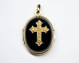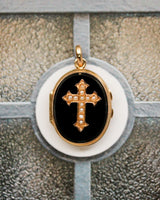 Pendentif en or rose 750 millièmes ouvrant, orné de chaque côté de plaques d'onyx. L'une des faces est agrémentée d'une croix en or rose sertie de demi perles fines. Volet en verre cerclé d'or mobile à l'intérieur permettant de glisser une photo. Chaîne non fournie, sur commande.