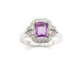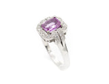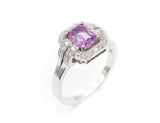 Bague Création en or blanc 750 millièmes dont le saphir rose de Ceylan taille coussin de 1,32 ct est serti sur quatre griffes et entouré de diamants dans un décor rectangle pans coupés. De chaque coté, deux godrons sertis de diamants, inspiré de l'Art Déco, descendent sur le corps de bague.