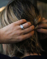 Bague Solitaire Création Benoit en or blanc 750/e, ornée au centre d'un plateau carré pans coupés, d'un diamant de 3,46 carats certifié HRD, serti par quatre griffes boules. Les palmettes, sont serties par deux Diamants navettes et quatre Diamants tailles brillants, soulignées par deux godrons discrets et marque le corps de bague en double anneau fin.