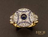 - Pierres : Saphir cabochon ~0,30 ct, pavage Diamants ~0,40 ct, saphirs calibrés ~0,15ct