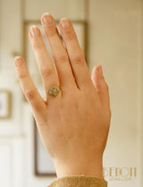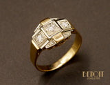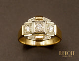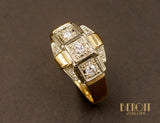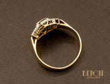 Bague en or rose 750 millièmes dont la tête de bague se compose de trois diamants taille ancienne sertis en carrés d'or blanc 750 millièmes, ornés de petits diamants taille rose aux quatre coins ponctué de deux aplats d'or rose. Corps de bague sobre, ruban en fuite. Joli détails de millegrain.