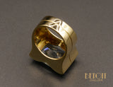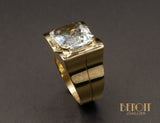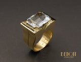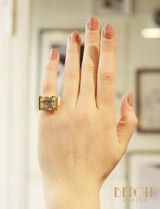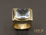Bague Tank en or jaune 750 millièmes, sertie d'une aigue marine rectangle à pans coupés sur quatre griffes au centre d'un "livre ouvert". Corps de bague large en fuite, comme fait de deux parties. Bijou en très bon état.