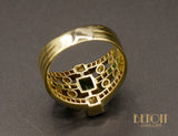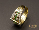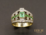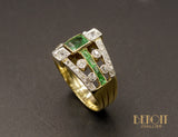 Bague en or jaune 750 millièmes de style bandeau dont la tête de bague est ornée en son centre d'une émeraude taille émeraude sertie en clos rectangle, surmontée de deux diamants taille ancienne serties en carrés millegrainés réhaussés de platine. De part et d'autre de la tête de bague, l'anneau est composé de trois lignes successivement serties de diamants taille rose sur réhauts de platine ou d'émeraudes calibrés, séparées par des diamants taille ancienne sertis en clos de platine. Joli détails de millegrain, belles mises à jours. Corps de bague large décoré de lignes sciées.