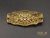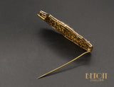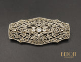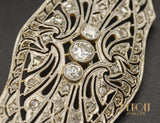 Broche Art Déco en or Jaune 750 millièmes entièrement rehaussée de platine et sertie de diamants, taille rose, dont les motifs courbés de pleins et de vides et ponctués par cinq diamants principaux, taille ancienne, sertis en clos. Système broche à l'arrière en or jaune 750 millièmes avec fermoir à pompe. Travail de millegrain sur tout le plateau.