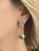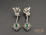Boucles d'oreilles pendantes Art Déco en or blanc 750 millièmes dont le sommet stylisant un nœud pavé de diamants taille moderne, est relié par une ligne de sept diamants taille moderne à une Emeraude taille Emeraude sertie, en clos, au centre d'un pavage de diamants formant comme le halo d'une étoile. Système pour oreilles percées.