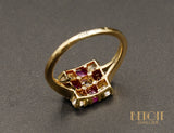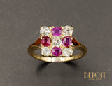 Bague de style Art Déco, en or jaune 750 millièmes dont le plateau carré est serti de diamants taille ancienne alternés de rubis ovales créant un damier. Palmettes en deux parties se regroupant pour former le corps de bague. Bijou délicat et fin.