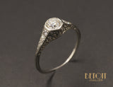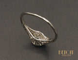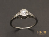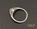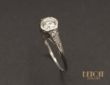 Solitaire en platine avec un joli travail de repercé, le diamant central taille ancienne d’environ 0,45 carat est monté dans un serti hexagonal avec grains dans les angles et épaulé de chaque côté par 2 diamants taille moderne.