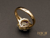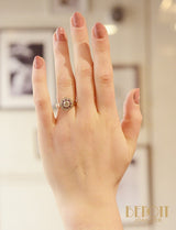 Bague en or rose 585 millièmes dont le plateau entièrement réhaussé de platine est orné d'un diamant taille ancienne central estimé H/I-Si, serti en clos. Tout autour, les premiers pétales de l'entourage sont sertis de rubis calibrés, puis le deuxième entourage est pavé de diamants taille ancienne. Panier finement ouvragé, palmettes en fuite accompagnées de volutes de part et d'autres. Corps de bague simple.