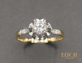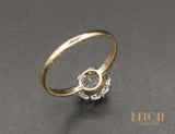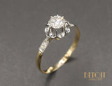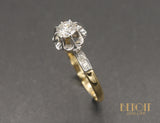 Solitaire en or rose 750/e orné en son centre d'un diamant taille moderne d'environ 0,40 carat, estimé environ H-SI, serti dans un chaton gaufré d'or blanc 750/e huit griffes, posé sur un corps de bague demi-jonc, orné de deux diamants sur les palmettes. Présence de billes, retirables sur demande.