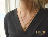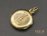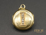 Pendentif ancien en or jaune 750/1000e, comportant une partie ouvrante, à l'intérieur de laquelle un verre permet le placement d'une photo ou d'un message. L'extérieur du médaillon est orné de la lettre I sertie de pierres de lune en cabochon. La bélière du pendentif est simple. Le pendentif peut être proposé avec une chaîne neuve en or jaune 750/1000e.