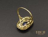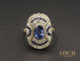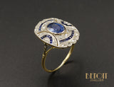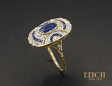 Bague de style Art Déco en or jaune 750/1000e dont la tête ovale, surmontée de platine, est sertie en son centre d'un saphir bleu taille ovale serti dans un clos. De chaque coté du plateau, partent quatre barres arrondies de saphirs calibrés dont les vides sont sertis de diamants taille rose. Travail de millegrain sur tout le serti. Le corps de bague est orné d'un losange serti d'un diamant taille rose. Bijou fin et délicat.