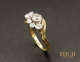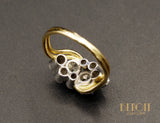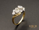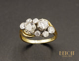 Joli Toi et Moi en or jaune 750 millièmes dont les deux diamants taille ancienne sont sertis sur chatons six griffes de platine. Trois diamants taille ancienne sertis en clos soulignent chacun des diamants centraux. Corps de bague formé de deux fils d'or jaune s'enroulant autour de la tête de bague dans un style tourbillon. Bijou élégant.