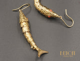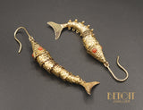 Paire de pendants d'oreilles en or jaune 750 /e en forme de poisson, articulés entièrement dont les yeux sont sertis de corails. Le corps est entièrement ciselé d'écailles. Système col de cygne en or jaune 750 / e.